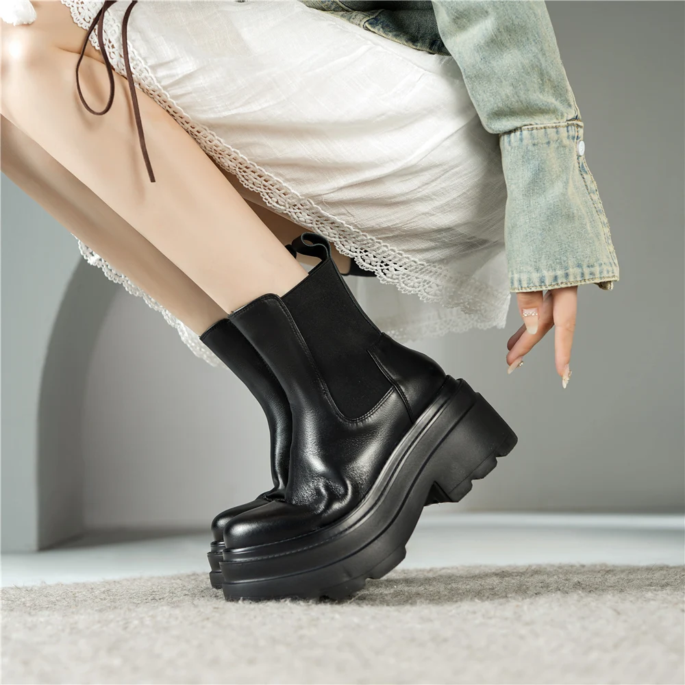 Women Ankle Boots Thick High Heels Genuine Leather Splicing Shoes Woman Autumn Winter Leisure Casual Outdoor
