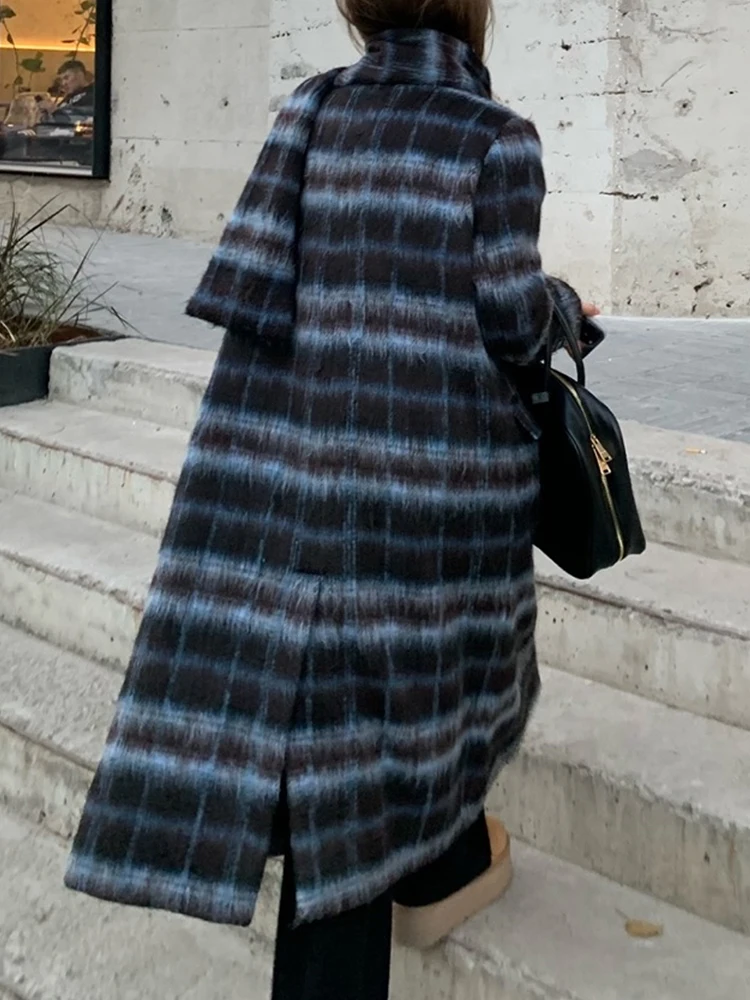 The coat features a sophisticated plaid pattern combined with a structured lapel collar and double-breasted front closure. This classic tailoring creates a refined silhouette that enhances elegance while maintaining a comfortable and versatile fit.