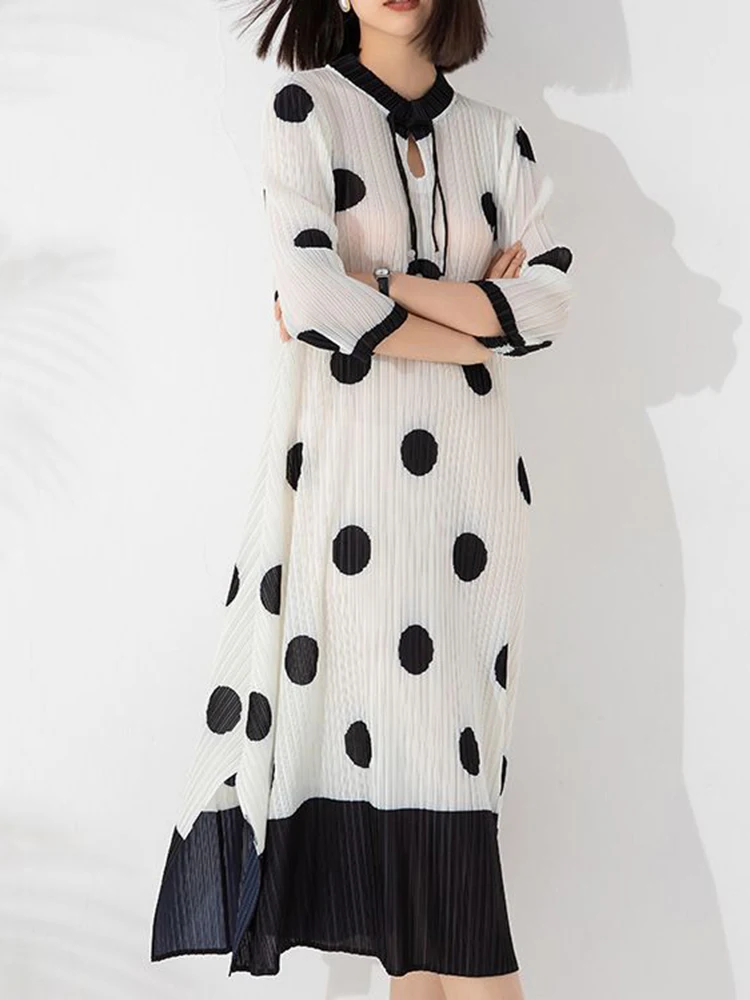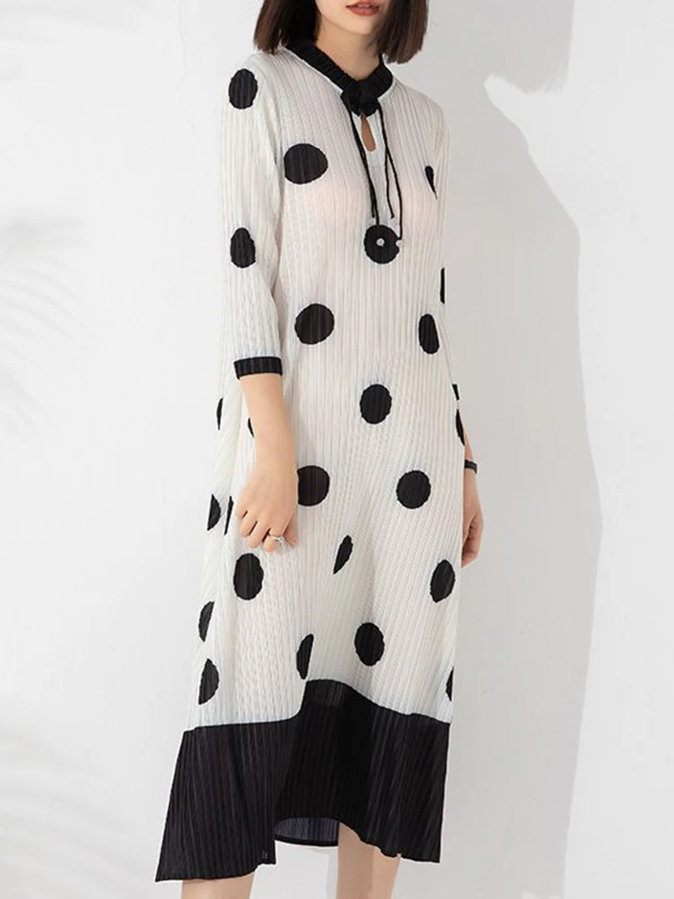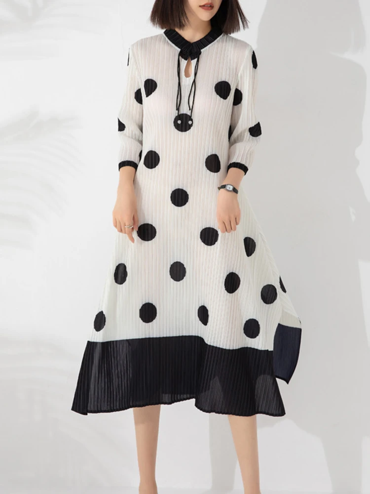 [sbrand] Pleated Polka Dot A-Line Women’s Dress Round Neck Patchwork Holiday Midi Dress