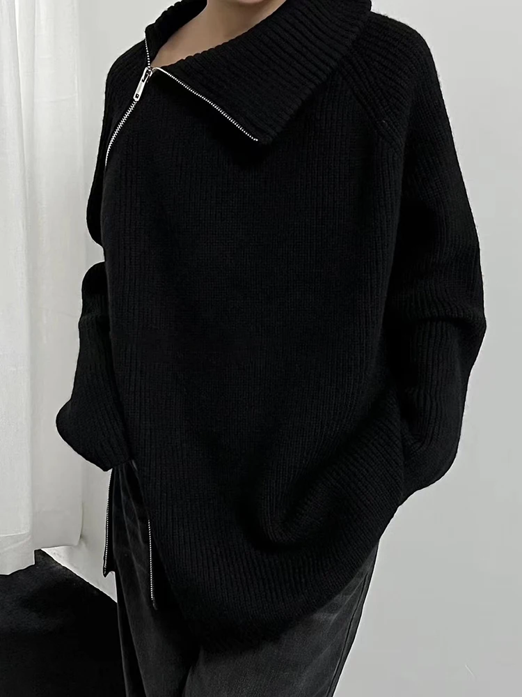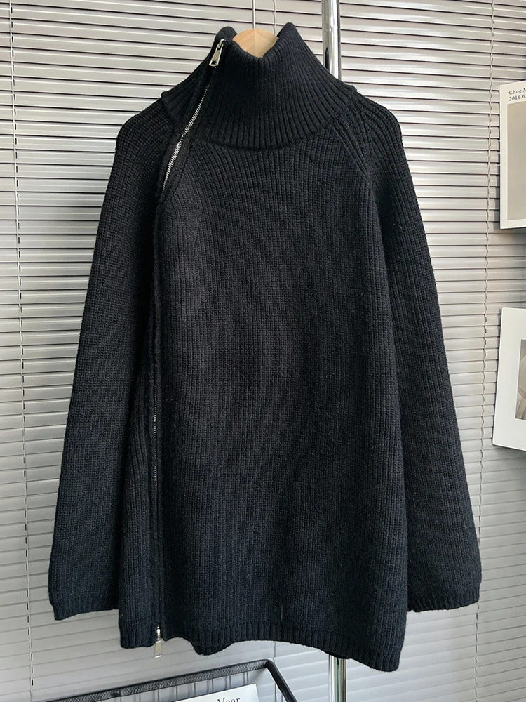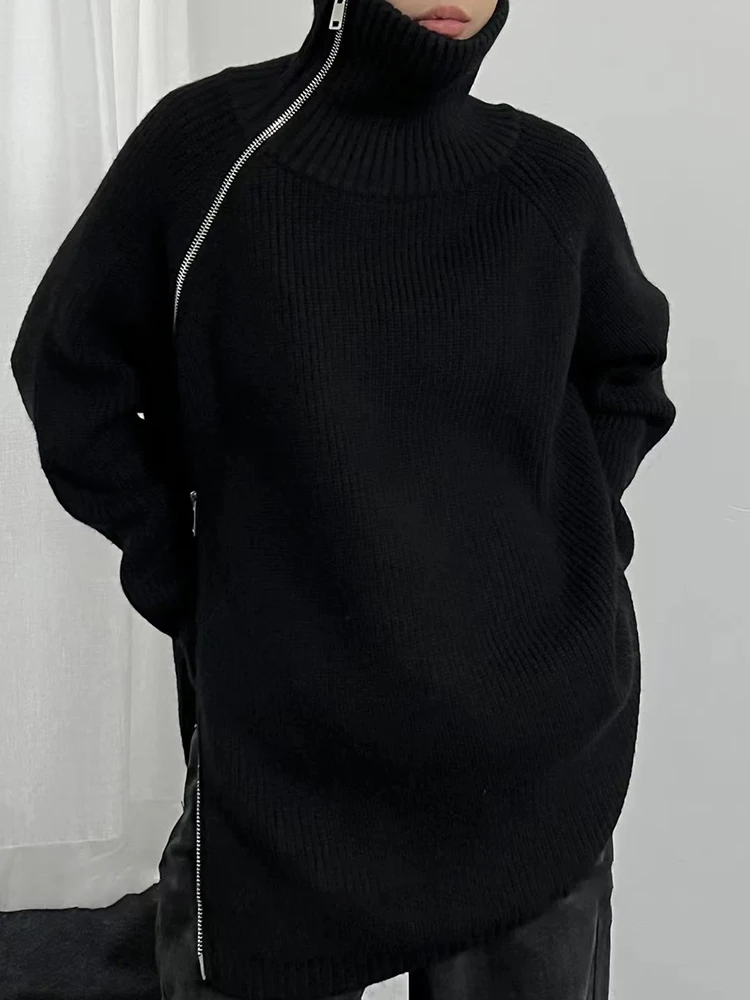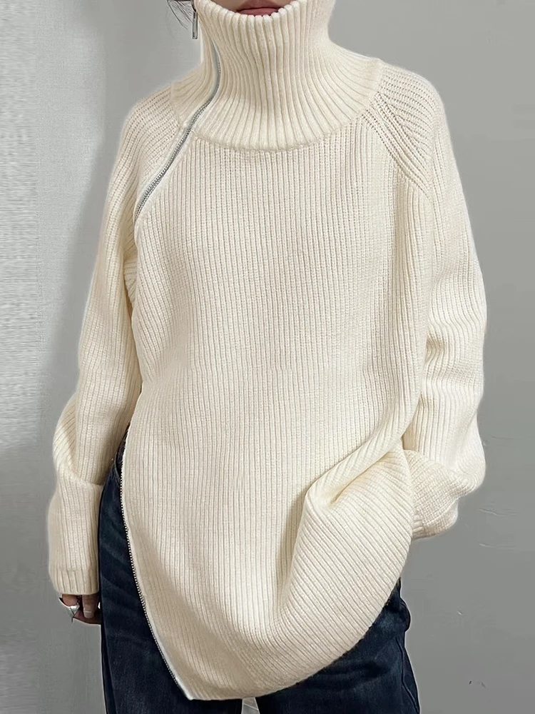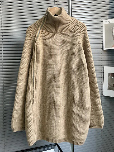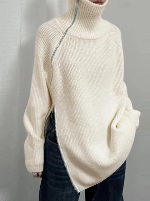 The sweater features a sleek turtleneck collar and streamlined silhouette, creating a refined and sophisticated look. The zipper front detail adds modern functionality while maintaining a clean and minimal aesthetic.